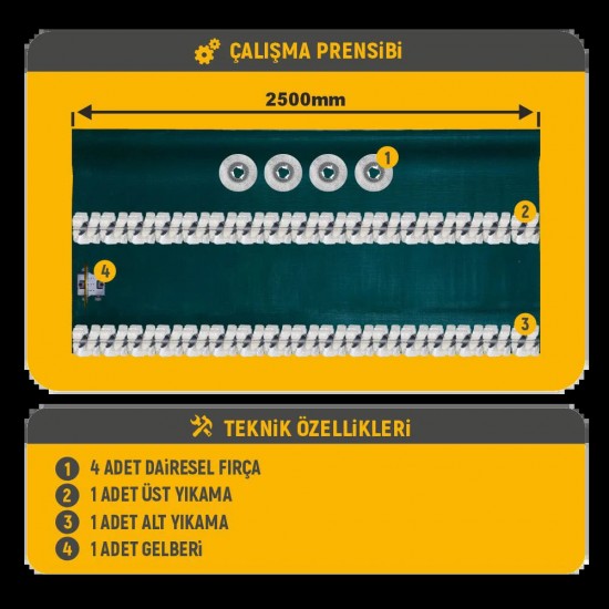 ALP 2500 F6 Masa tip otomatik halı yıkama makinesi 4 mm gövde kalınlığına,4 adet 40 cm çapında halı yıkama fırçasına,1 adet silindir şeklinde üst kıl toplama ve durulama fırçasına ,durulamalı gelberi sistemine ve halı altı yıkama fırçasına sahip ,istenildiğinde manuel istenildiğinde de otomatik olarak kullanılabilen dokunmatik ekranlı ,4 fırçalı otomatik halı yıkama makinesidir.ALP 2500 F6 model tam otomatik halı yıkama makinesi tek personel tarafından rahatlıkla kullanılabilmektedir.ALP 2500 F6 model 4 fırçalı otomatik halı yıkama makinası günlük halı yıkama kapasitesi 400-500 m² civarında olan halı yıkama firmaları tarafından tercih edilen masatipi 4 fırçalı otomatik halı yıkama makinasıdır .4 mm gövde kalınlığına sahip olan ALP 2500 F6 model 4 fırçalı otomatik halı yıkama makinası 250 cm bant genişliğine sahiptir. Bu sayede 2 metre genişliğindeki halıları rahatlıkla yıkayabilmektedir.